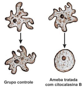 O esquema representa um experimento feito com células do protozoário Amoeba proteus. Nele, um grupo de células foi tratado com a droga citocalasina B, enquanto outro grupo não foi tratado, servindo como controle. O formato e o movimento das células tratadas foram comprometidos.
