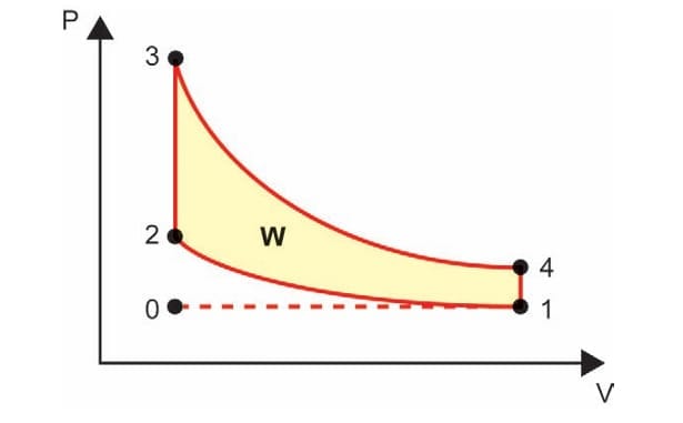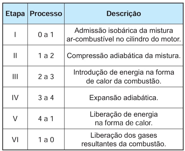 O diagrama P-V a seguir representa o ciclo de Otto para um motor de combustão interna, como os motores a gasolina ou a etanol, utilizados nos automóveis.