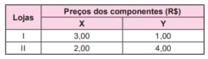 Um artesão utiliza dois tipos de componentes, X e Y, nos enfeites que produz. Ele sempre compra todos os componentes em uma mesma loja. O quadro apresenta os preços dos dois tipos de componentes nas lojas I e II.
