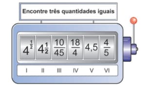 Uma professora de matemática utiliza em suas aulas uma “máquina caça-números” para verificar os conhecimentos de seus estudantes sobre representações de números racionais. Essa máquina tem um visor dividido em seis compartimentos e, na lateral, uma alavanca. Cada estudante puxa a alavanca e espera que os compartimentos parem de girar. A partir daí, precisa responder para a