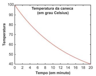 Uma caneca com água fervendo é retirada de um forno de micro-ondas. A temperatura T, em grau Celsius, da caneca, em função do tempo t, em minuto, pode ser modelada pela função T(t) = a + 80   representada no gráfico a seguir.