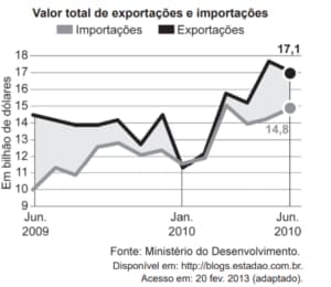 O gráfico apresenta o valor total de exportações e o valor total de importações, ao longo de um período, em bilhão de dólares. O saldo da balança comercial brasileira é dado pelo valor total de exportações menos o valor total de importações num mesmo período.