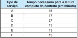 O tempo médio, em minuto, necessário para a leitura completa de um contrato de serviço dentre os listados no quadro é, com uma casa decimal, aproximadamente