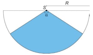 Um proprietário pretende instalar um sensor de presença para a proteção de seu imóvel. O sensor deverá detectar movimentos de objetos e pessoas numa determinada região plana. A figura ilustra a vista superior da área de cobertura (setor circular em azul) de um sensor colocado no ponto S. Essa área depende da medida do ângulo α, em grau, e do raio R, em metro.