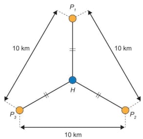 A prefeitura de uma cidade planeja construir três postos de saúde. Esses postos devem ser construídos em locais equidistantes entre si e de forma que as distâncias desses três postos ao hospital dessa cidade sejam iguais. Foram conseguidos três locais para a construção dos postos de saúde que apresentam as características desejadas, e que distam 10 km entre si, conforme o esquema, no qual o ponto H representa o local onde está construído o hospital; os pontos P1, P2 e P3, os postos de saúde; e esses quatro pontos estão em um mesmo plano.