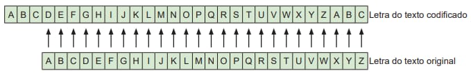 A criptografia refere-se à construção e análise de protocolos que impedem terceiros de lerem mensagens privadas. Júlio César, imperador romano, utilizava um código para proteger as mensagens enviadas a seus generais. Assim, se a mensagem caísse em mãos inimigas, a informação não poderia ser compreendida. Nesse código, cada letra do alfabeto era substituída pela letra três posições à frente, ou seja, o “A” era substituído pelo “D”, o “B” pelo “E”, o “C” pelo “F”, e assim sucessivamente.