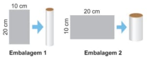 Uma indústria faz uma parceria com uma distribuidora de sucos para lançar no mercado dois tipos de embalagens. Para a fabricação dessas embalagens, a indústria dispõe de folhas de alumínio retangulares, de dimensões 10 cm por 20 cm. Cada uma dessas folhas é utilizada para formar a superfície lateral da embalagem, em formato de cilindro circular reto, que posteriormente recebe fundo e tampa circulares. A figura ilustra, dependendo de qual das duas extensões será utilizada como altura, as duas opções para formar a possível embalagem.