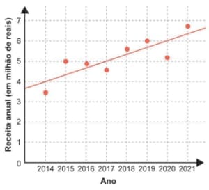 As receitas anuais obtidas por uma indústria no período de 2014 a 2021, em milhão de reais, foram registradas, por pontos, em um gráfico. Nele, também está representada a reta que descreve a tendência de evolução das receitas. Essa reta pode ser utilizada para estimar as receitas dos anos seguintes.
