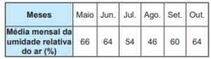 A umidade relativa do ar é um dos indicadores utilizados na meteorologia para fazer previsões sobre o clima. O quadro apresenta as médias mensais, em porcentagem, da umidade relativa do ar em um período de seis meses
