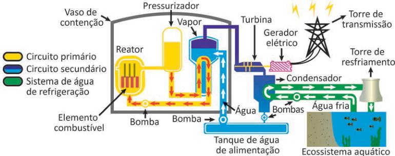 As usinas termonucleares são aquelas que produzem energia elétrica a partir da geração de energia térmica proveniente das reações nucleares. Normalmente, essas usinas funcionam por meio de dois circuitos, denominados circuito primário (vaso de pressão, pressurizador e bomba) e circuito secundário (gerador de vapor, turbina, condensador, tanque de alimentação e bombas), além de um sistema de água de refrigeração, formado por uma bomba ligada a uma fonte hídrica natural.