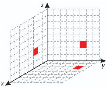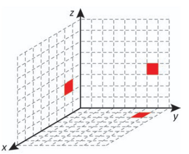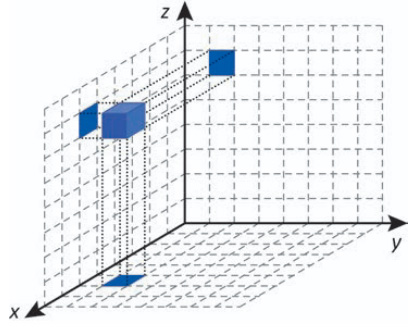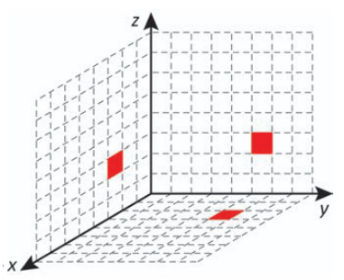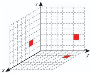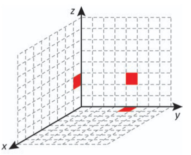 Cada deslocamento efetuado por esse cubo se dá sempre em uma das direções definidas pelos três eixos coordenados. Ao se movimentar a partir da posição inicial, esse cubo se aproximou 3 unidades do plano yz, se afastou 5 unidades do plano xz e se aproximou 4 unidades do plano xy.