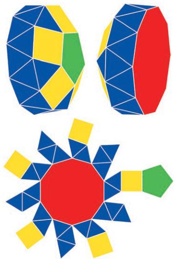 As figuras apresentam esse poliedro em duas posições e uma de suas planificações.