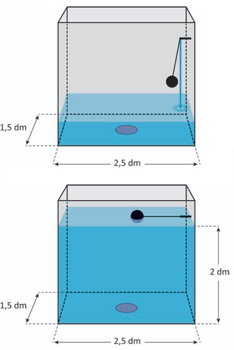 Uma caixa de descarga, acoplada a um vaso sanitário, tem a forma de paralelepípedo reto retângulo cujas dimensões internas da base são 2,5 dm e 1,5 dm. Nessa caixa há uma boia que interrompe o abastecimento quando a altura da coluna de água atinge 2 dm, conforme a figura.