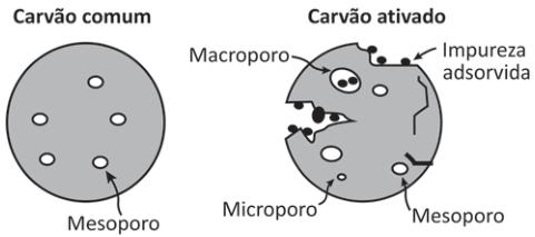 A filtração em carvão é uma das mais antigas formas de purificação de água. O carvão ativado, diferentemente do carvão comum, é útil para ser empregado na remoção de material orgânico, cloro e outros contaminantes. Essa capacidade decorre de suas propriedades de adsorção. A origem do material utilizado para produzir o carvão ativado pode influenciar sua porosidade e, consequentemente, interferir na capacidade do material de remover impurezas. Na figura, é ilustrada esquematicamente a diferença entre as estruturas físicas do carvão comum e do carvão ativado.