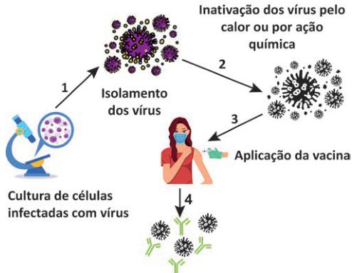 A produção de vacinas exige uma sequência de procedimentos, além do cumprimento estrito de verificações de segurança. No esquema, estão demonstradas as etapas básicas realizadas para a fabricação de uma vacina utilizando a tecnologia tradicional e o efeito dela no organismo.